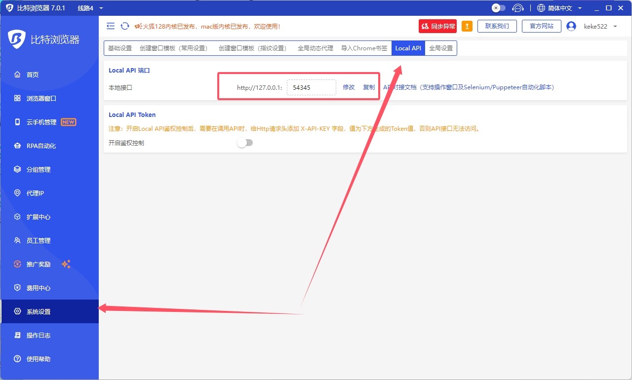 比特浏览器ApiURL在系统设置-Local API - 本地接口