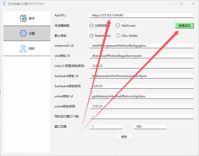 把本地接口复制填写进空头神器-设置中的ApiURL并选择浏览器类型,选择填写完成点击测试连接,如果显示连接成功即可